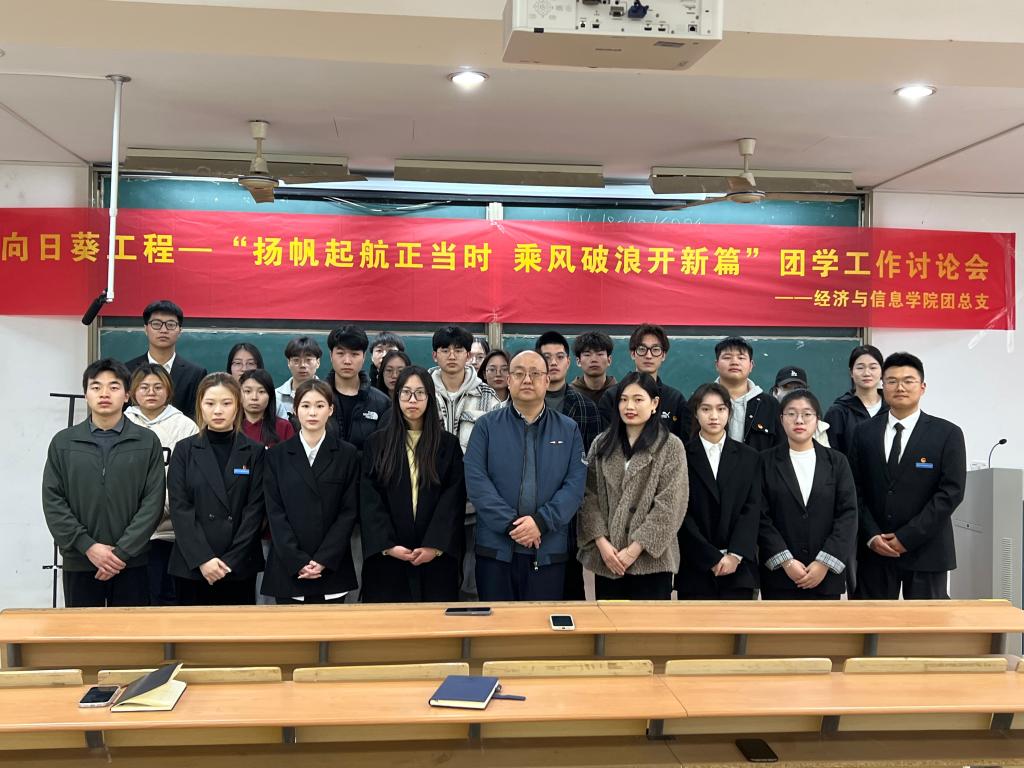 为进一步丰富“情感育人”文化内涵,推进“向日葵工程”建设,经信学院团总支于B101召开“扬帆起航再出发,乘风破浪开新篇”团学工作大讨论。学院党总支副书记王志远、团总支书记李瑞玲及全体团学干部参于本次会议。