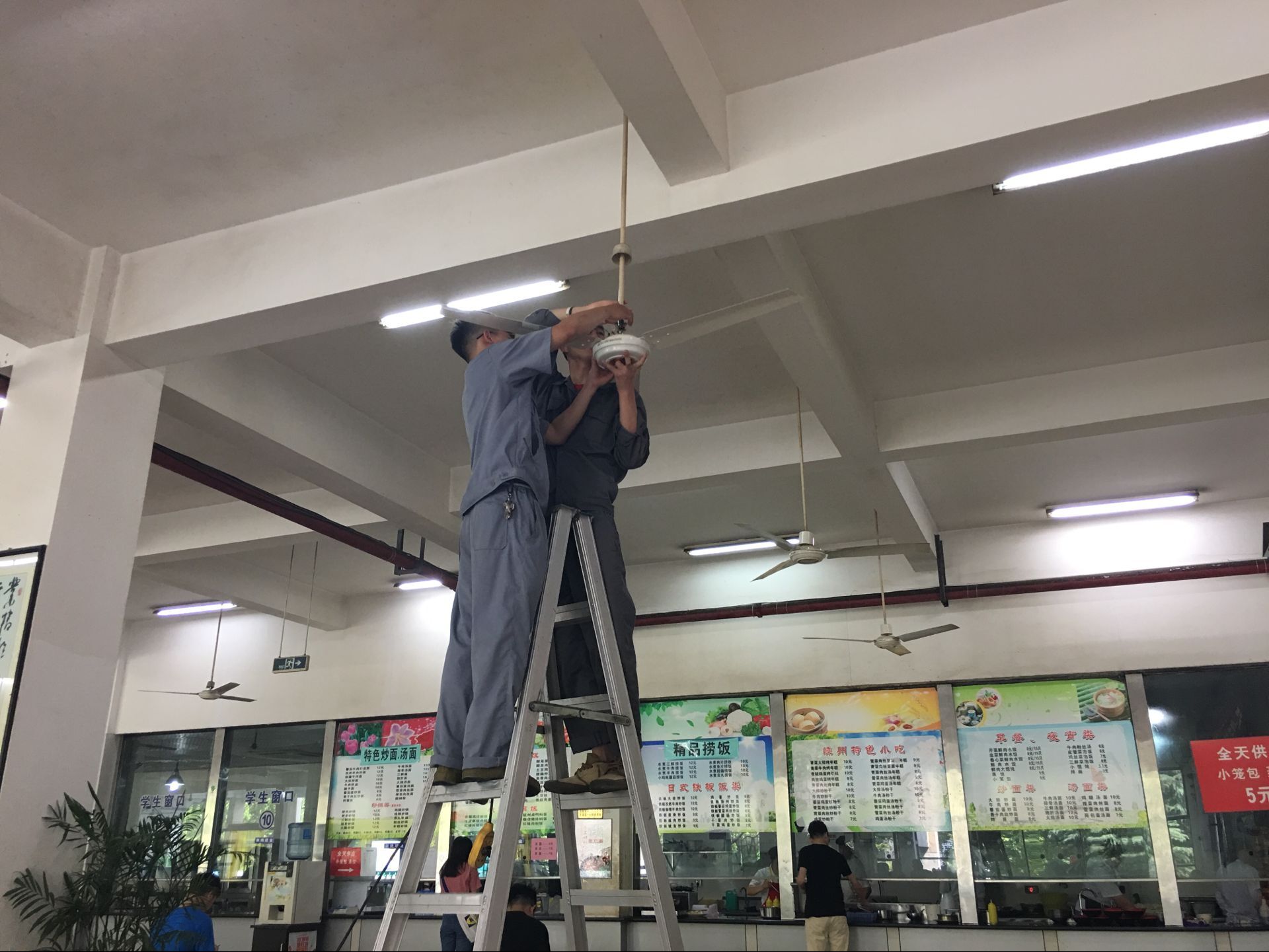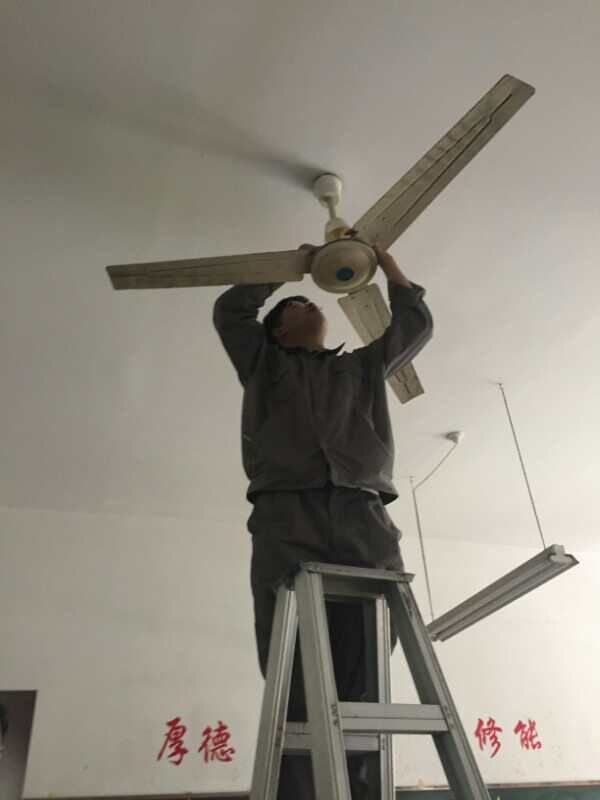 检修人员对每一台吊扇的紧固件及叶片都进行了详细检查,发现有磨损或松动的螺丝、叶片有变形的立即予以更换,并顺带做了叶片的清洗工作,确保每一台吊扇正常安全地运转。这也是后勤服务中心紧抓安全,心系师生的体现。