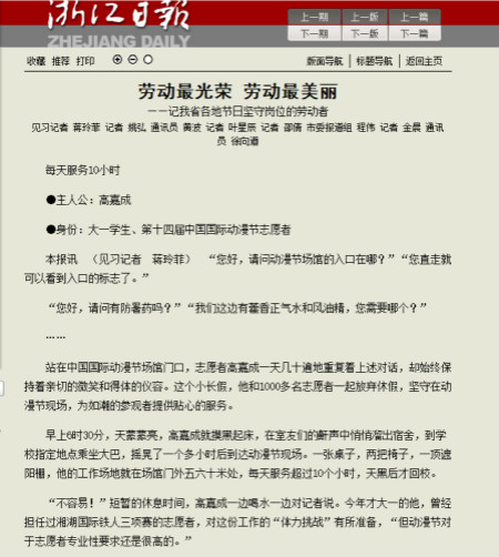 2018年4月26日至5月1日第十四届中国国际动漫节在杭州滨江白马湖举行,我院共65名志愿者参与微笑亭和广场互动秀两大块志愿服务工作。其中团委实践部高嘉成同学因表现优异,受到浙江日报记者单独采访,作为五一劳动节志愿服务代表刊登在浙江日报和浙江新闻客户端上。