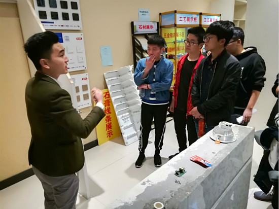 建工系师生来到金之尚装饰公司,李鹏军副总经理及相关部门经理热情接待了大家。在李总引领下,学生们有秩地开始了“金之尚装饰之旅”。参观了风格迥异的样板房,设计师耐心细致讲解了整个装饰的流程,特别强调了水电装修中的重要性,让大家感受到细致入微的工作和体贴的服务是留住客户的关键;设计师们还给大家讲解了针对不同的客户群体侧重点不一样,以及利用色彩在装修中的视错觉拓宽家的空间和营造轻松温暖的家庭氛围;在体验馆大家还了解了瓷砖、木地板、门窗设计、厨房设计、卫生间设计、电视墙设计、橱柜设计、墙布、壁纸以及新风系统等。精美的家装建材、高雅的家居风格,让学生兴奋不已。