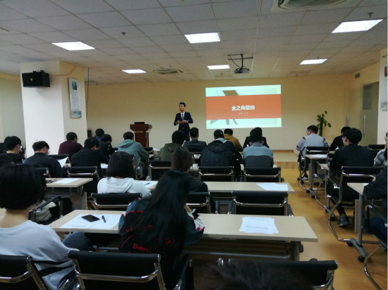现场参观结束后,同学们走进了金之尚装饰公司会议室,李鹏军副总经理还向师生们介绍了装饰行业发展状况、与社会经济发展的紧密联系,理论联系实际、深入浅出地阐述了装饰行业的设计师及从业人员应该具备的基本素质、需要学习的知识技能及实习、就业的心态。同时还与大家分享了自己成为设计师的成长足迹,他说“要做装饰行业就一定要做顶尖的,这样才能立足社会”,更多的告诫同学们学会学习,学会沟通,和客户交流需要换位思考等。最后,同学们再次对金之尚装饰公司提供的这次教学实践机会深表感谢。