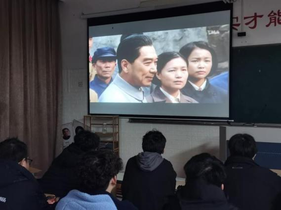 活动开始,班长郑赐炯组织同学们以小组为单位分享自己整理的周总理的事迹。对周总理来说,只要是人民的事,那就绝没有小事,人民大于一切。他将人民装在心中,人民将他高高举起。随后,大家一起怀着崇敬的心情,观看电影《周恩来的四个昼夜》,在本片中同学们看到了周总理与人民之间的双向奔赴:在大雨之夜,总理不顾身体的虚弱与疲惫,带着工作人员与群众抢救地瓜苗;在寂静的夜晚,总理彻夜梳理调研成果,与毛主席汇报发现的问题……这一个个镜头,让我们真切地感受到“为人民服务”它不仅仅是一句口号,而是领袖人物与普通百姓间零距离的接触与交流,是一种自觉置身于群众之中、“俯首甘为孺子牛”的奉献。影片结束后,同学们纷纷举手发言,分享自己心中最真实的感触,表达对总理的崇敬之情。