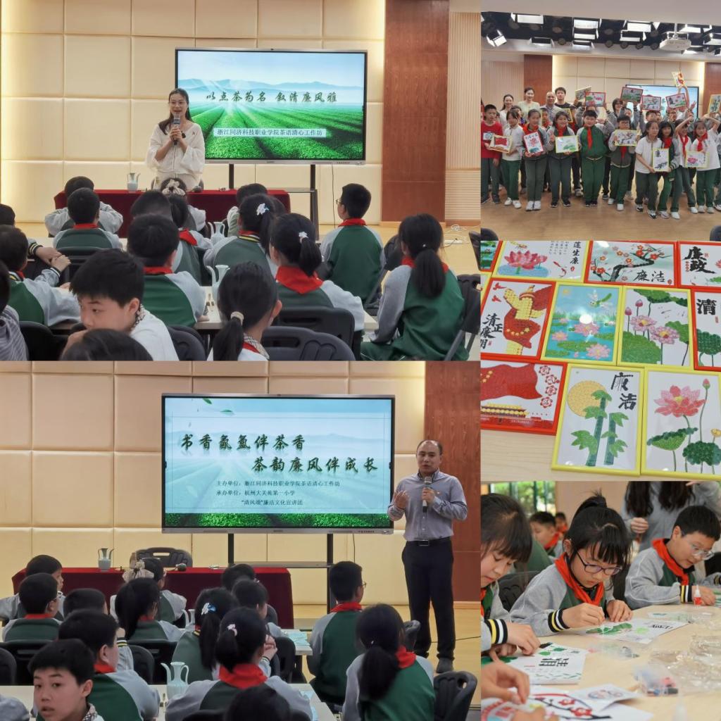 为了将廉洁文化融入学生隐形教育,加强师生的理想信念教育、廉洁荣辱教育,发挥廉洁文化育人作用,有效推动大中小学廉洁思政教育的一体化建设。4月1日下午,学校“清风颂”廉洁文化宣讲团携手经信学院茶语清心工作坊走进杭州大关苑第一小学,赴一场“茶”与“廉”的盛宴。