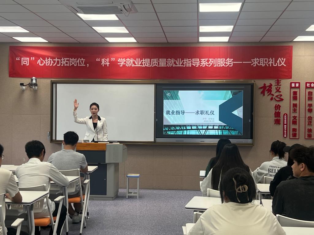 为助力求职者更快获得就业机会,更好适应职场环境。2024年6月5日学校在钱江楼315开展“‘同'心协力拓岗位,‘科'学就业提质量”就业指导系列服务——求职礼仪讲座,本次活动由中商联商业职业技能鉴定中心高级礼仪培训师、高级政务礼仪指导师、企业人力资源管理师孙彤雨和美国认证协会注册ACI高级礼仪培训师、英国伦敦城市协会认证高级形体仪态师邱郁含主讲。