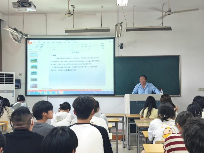 会议邀请了浙江宏正项目管理有限责任公司技术负责人胡黎明高工给同学们讲授了一堂生动而有趣的开学第一课。胡工从事土地整治项目近二十年,主持(参与)编制了《土地整治项目实施管理实务》,《浙江省土地整治项目验收规程》,《浙江省土地整治工程施工质量检验与评定规程》等相关规范与规程,具有非常丰富的理论和实践经验。