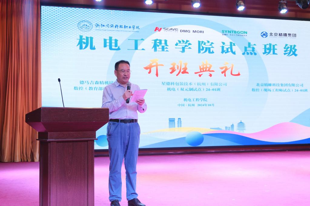 10月16日,机电工程学院第三届试点班开班典礼在瓯江楼水韵剧场隆重举行。学校党委委员、副校长吴敏启,星德科包装技术(杭州)有限公司高级生产经理陈炎,北京精雕科技集团有限公司教育运营总监于洋,德马吉森精机培训学院教育经理张培星出席典礼,学校教务处、学工部、发展合作处及企业相关部门负责人、机电工程学院领导班子及相关教师、试点班全体学生参加开班典礼。典礼由机电工程学院副院长(主持工作)孙连栋主持。
