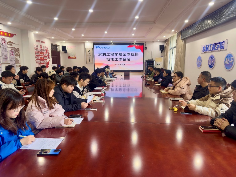 为加强班级思想建设,确保期末相关工作的正常开展,水利工程学院于12月29日召开了全体班长2024-2025学年第一学期期末工作会议。本次会议由学院党总支副书记许源主持,学院全体辅导员及2023级、2024级全体班长参会。