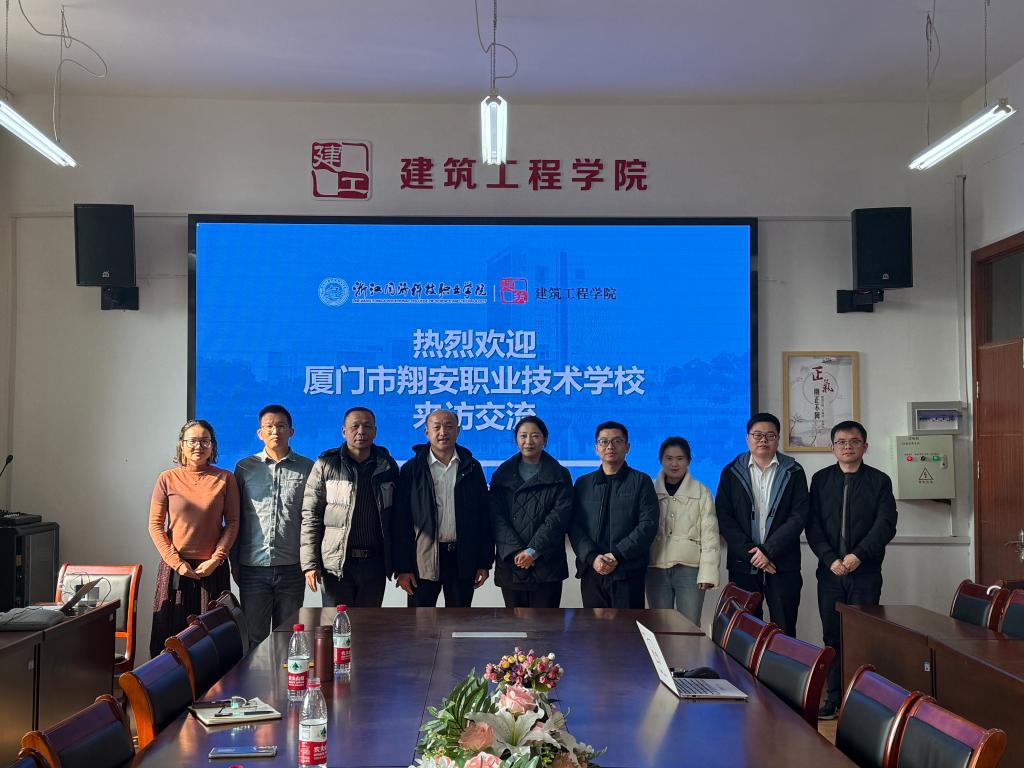 12月26日,厦门翔安职业技术学院校长简顺展一行3人来学校交流学习。建筑工程学院院长马知瑶、副院长李毅热情接待简顺展一行。