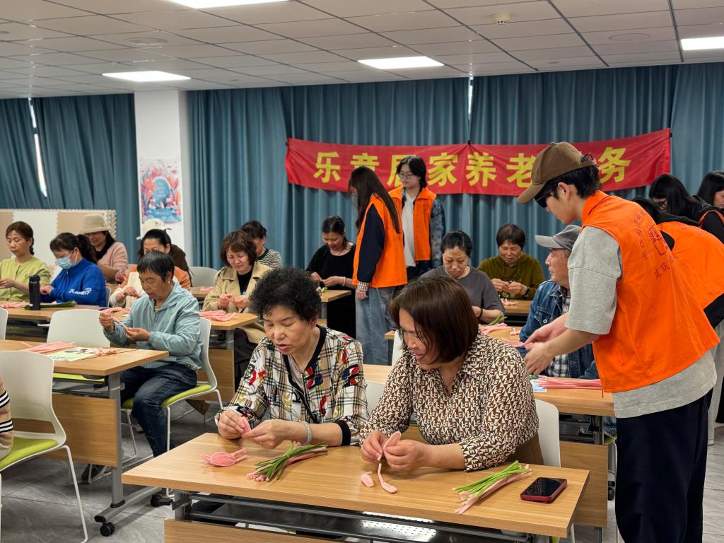 活动中,鸿宁社区精心准备了制作扭扭棒花朵的手工活动,志愿者们耐心地指导爷爷奶奶们如何操作,一步步将彩色的扭扭棒编织成一朵朵栩栩如生的花朵。活动现场其乐融融,老人们与志愿者共同享受着制作过程中的乐趣与成就感。
