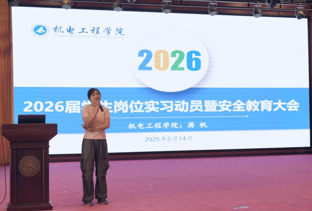 5月14日上午,机电工程学院在瓯江楼水韵剧场召开2026届学生岗位实习动员暨安全教育大会。学院党总支书记章卉、副院长蒋帆、副书记徐菁晶,各专业部主任、实习班级班主任及2023级全体实习学生参会。会议由学院副院长蒋帆主持,围绕“认识实习意义、筑牢安全防线、落实管理要求”三大主题展开,为即将踏上实习岗位的405名学生指明方向、保驾护航。