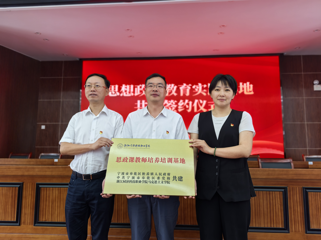 随后,三方签署《思想政治教育实践基地共建协议》,并共同为“三方联建思想政治教育实践基地”揭牌。这一合作标志着三方将围绕“资源共享、人才共育、项目共研、品牌共创”等目标,在红色文化研究、思政课程开发、党建活动联办等领域展开全方位合作。“松岙镇是一片红色热土,通过三方联建,共建‘大思政课’实践教学基地,核心在打破课堂与社会的壁垒,让青年学生在沉浸式课堂中感悟红色基因,真正实现铸魂育人。”校党委委员、副校长吴敏启在接受奉化电视台采访时表示。