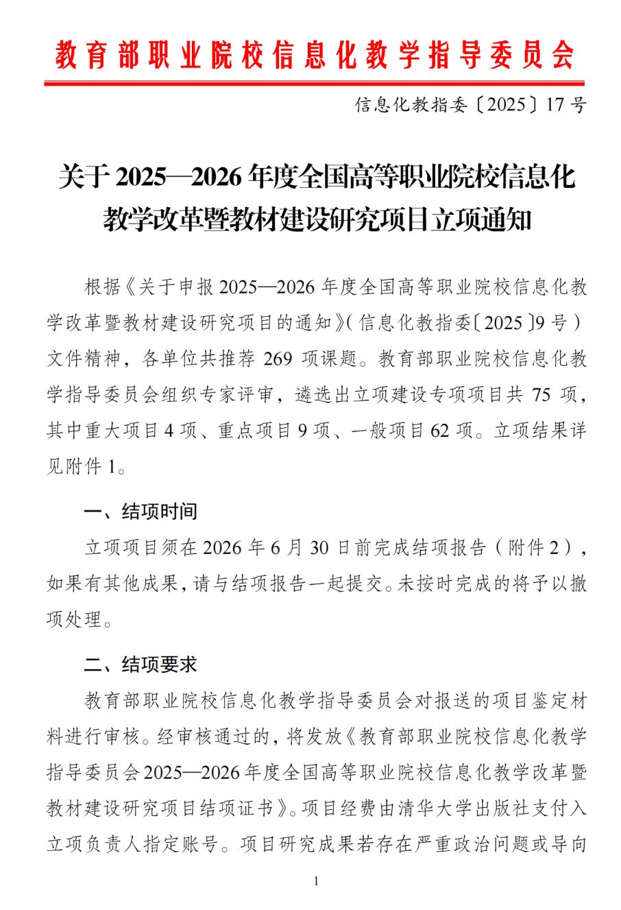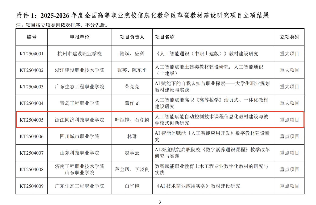 近日,教育部职业院校信息化教学指导委员会发布《关于2025-2026年度全国高等职业院校课程教学改革暨教材建设研究项目立项公示的通知》(信息化教指委〔2025〕15号),机电工程学院申报的《人工智能赋能自动控制技术课程信息化教材建设与教学模式创新研究》项目入选,被列为重点项目。