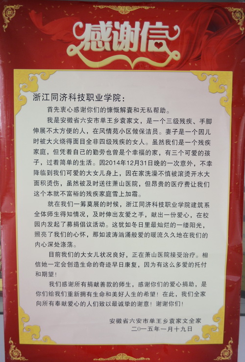 上学期,建筑系思政教育实践基地蓝天小学的一名一年级学生袁以慧同学在洗澡时不慎跌入热水桶,导致百分之四十皮肤被烫伤,而她的父母也都有三级残疾,高额的医疗费用对于这个家庭来说成了巨大的负担。得知此消息后,为了帮助该同学度过难关,建筑系阳光心理站于上学期末组织了“爱心手牵手”募捐活动,通过宣传和动员,活动受到了全体师生的积极响应,两天募得爱心款3251.3元,傅晓艳老师率同学亲自到萧山医院看望了正在接受治疗的袁以慧,并将捐款交到她手里。