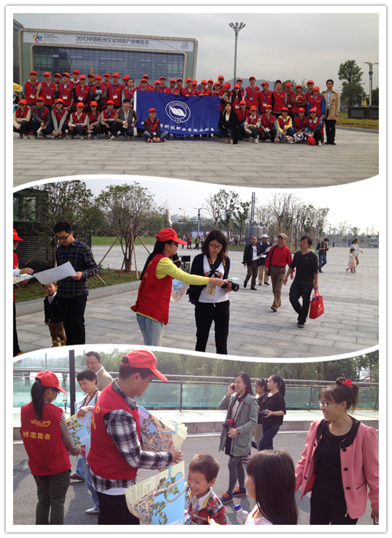 水利系志愿者主要负责场馆外围微笑亭、停车场、公交车站等地的志愿服务,主要提供信息咨询、引导服务、秩序维护、协助交通管理等内容。志愿者们克服了服务点多、任务量大、人员紧张、气温低等困难,顺利的完成了服务任务。水利系高素质的志愿者队伍和高水平的志愿服务,成为2013年中国(杭州)文化创意产业博览会的一大亮点,并得到了主办方的一致认可和高度表扬。