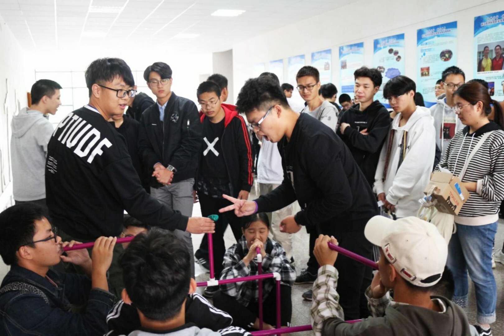 本次活动由六大部分组成,分别为心理“知”多少;情绪宣泄墙;刺激心跳圈;将心比心,争分夺秒;众人拾柴火焰高;横幅签名留念。同学们兴高采烈的参加每个小活动,或是脚上戴着甩腿球在指压板上蹦跳,或是蒙上眼睛听同伴指挥转动时针,或是组队齐心协力吹爆气球。“啊,有点扎”,“向上一点”,“加油啊”,“啊啊啊,马上就爆啦”,“boom!”,伴随着同学们的呐喊声和加油声,活动场面越来越热闹,气氛逐渐推向高潮,吸引了更多同学参与其中。在这里,大家全身心投入游戏活动中,忘却了烦恼和忧愁,笑容洋溢在每个人的脸上。
