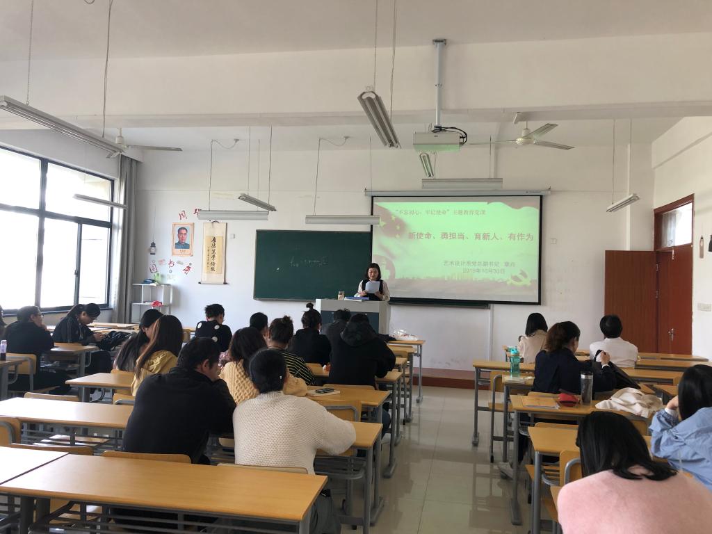 艺术设计系党总支副书记章卉以“新使命、勇担当、育新人、有作为”为题讲授专题党课。按照“四个讲清楚”的要求,讲清自己学习习近平新时代中国特色社会主义思想,特别是习近平关于“不忘初心、牢记使命”重要论述的认识体会;讲清存在的差距和不足;讲清指导实践、推动改进工作的思路措施;讲清悟初心、担使命的感悟。