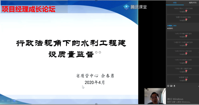 4月29日,项目经理成长论坛邀请到浙江省水利水电工程质量与安全监督管理中心佘春勇科长,在腾讯课堂开了题为《行政法下视角下的水利工程建设质量监督》的讲座。水利系将近600名学子和相应专业教师、大禹2018、大禹2019在线聆听了此次报告。
