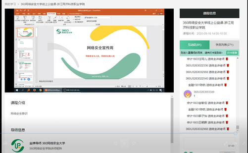开展线上“网络安全”讲座。结合信息安全与管理专业特色与优势,工管系党总支积极联系360网络安全大学,开展“师生共参与、网络话安全”讲座。讲座通过直播形式开展,线上线下共同参与的方式组织,邀请360网络安全大学金牌导师围绕网络安全法、移动存储介质安全、疫情期间网络诈骗等内容展开,受到师生欢迎与热议。除信息安全与管理专业的学生线下集中观看外,线上同时观看人数近300人,授课老师通过一个个具体生动的贴近生活的典型案例再现,提高了师生的法律意识和防范意识。