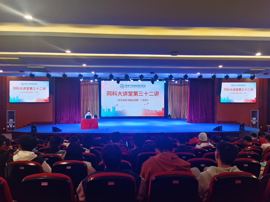 11月26日下午,同科大讲堂第三十二讲在瓯江楼小剧场举行。本次讲座邀请优秀校友工管系2018届毕业生谢格来院开讲,全院辅导员、各系学生代表近两百人到场聆听。