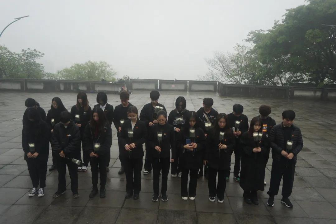 上午九点,雨越下越大,大雨阻挡不了同学们缅怀英烈,敬仰英烈的心。在到达烈士陵园后,每个人都拿了一朵白菊花,迈着坚定的步伐踏上了台阶,向高处的革命烈士纪念碑走去。五百多阶台阶,走得缓慢而沉重。面对着革命烈士永垂不朽的纪念碑,支部书记黄君老师给同学们讲解了此行的目的和重要性,并带领同学们进行了默哀、献花,最后对着革命烈士纪念碑庄严宣誓。