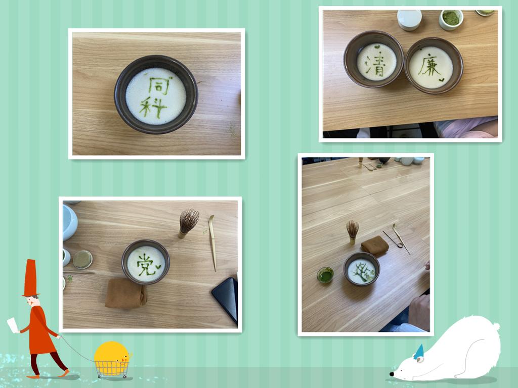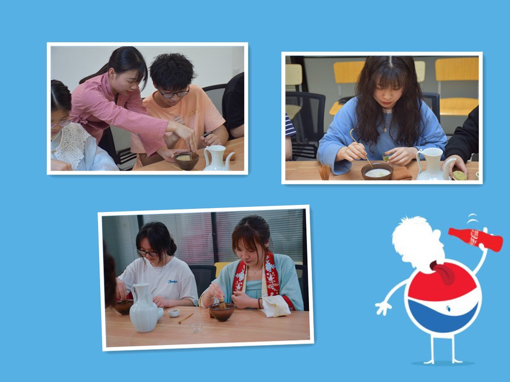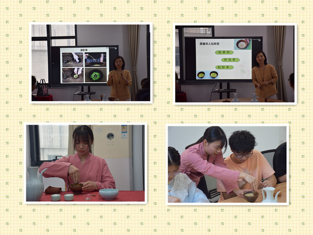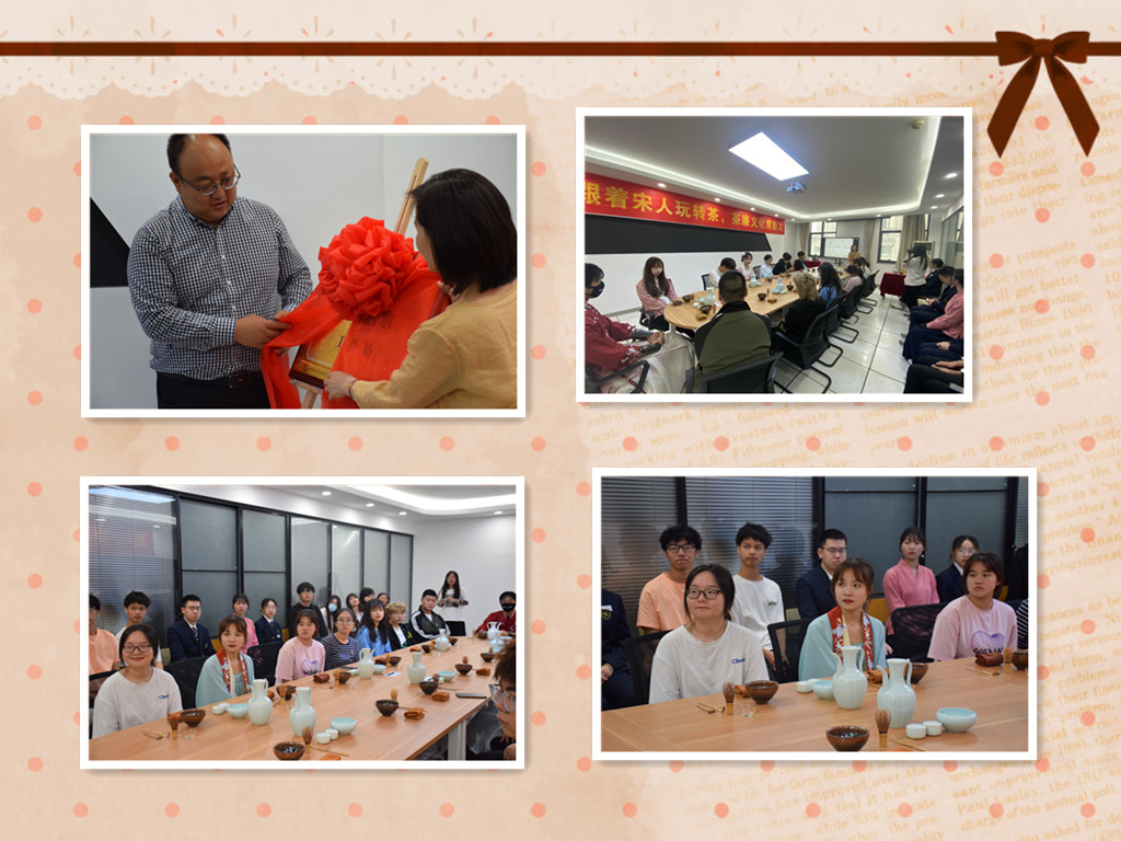 揭牌仪式之后,毛教授为在场的学生们授课,讲解了茶廉文化的深刻内涵,通过一个个生动形象的故事阐述了点茶的历史渊源,引导同学们在品茗的过程中调整心态,重新认识自己,感悟人生哲理。学生代表身穿古装,遵循宋代点茶仪轨,用三汤法演示了点茶的详细步骤备器、候汤、习茶,边演示边讲解,为参与者展现了一场视觉及文化盛宴。在毛老师的指导下,同学们体验了宋代点茶的各个步骤,学习了以茶为媒的生活礼仪,了解历史中人们的审美和生活追求,以“茶廉文化”为主题,绘制了茶百戏。