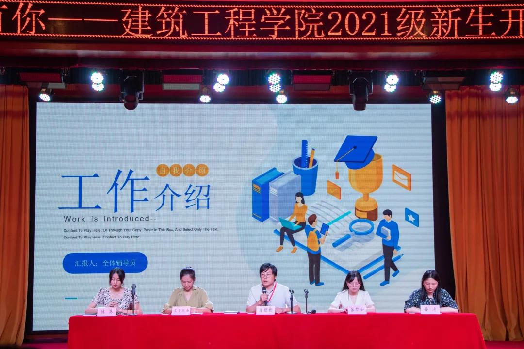 随后,建工学院张梦如、陈慧、孙琦、吴昊凯南四位辅导员老师针对各自分工向2021级学生介绍了有关心理调查、资助帮扶、创新创业、公寓管理、评奖评优等方面的相关政策流程,鼓励同学们在即将开始的大学生活里努力学习,开启新的人生征程。辅导员肖德彬则向新同学们介绍了学院的团学工作,并向大家提出一系列问题。第一,辅导员究竟是什么?在他看来辅导员是陪伴与引导,他以一段段真实事件展现了辅导员们的工作面貌;第二,在大学中问问自己要“找什么”“为什么要找”,以此树立适合自己的目标和方向。第三,什么是中华民族伟大复兴?他提醒同学们要关注这个时代和这个时代正在发生的事情。