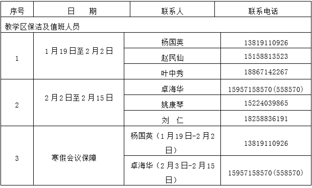 2、校园保洁及教学楼开关门值班人员安排。教学区域1月20日起开始实行闭门管理,若有教师需进入教学楼,请电话联系后勤值班人员张文斌。电话15924125727(655727)。