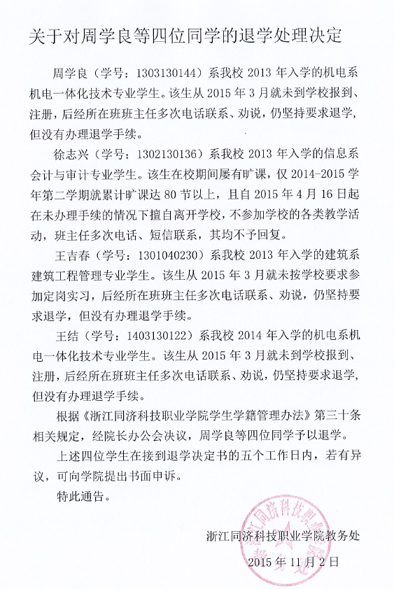 关于对周学良等四位同学的退学处理决定