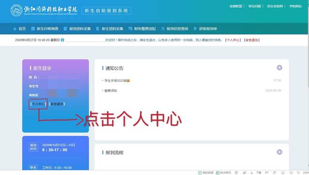 登录新生自主报到系统,点击个人中心(http://yx.zjtongji.elsa-china.com/)。
