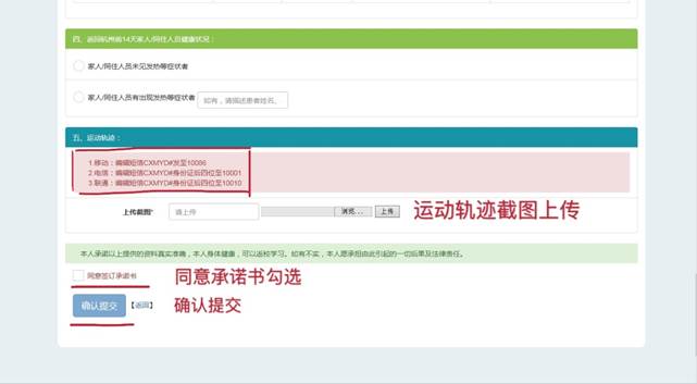 在“5.运动轨迹”中,需要先根据各自的号码发送指定代码给各个公司后截图上传。最后勾选同意签订承诺书,点击“确认提交”。