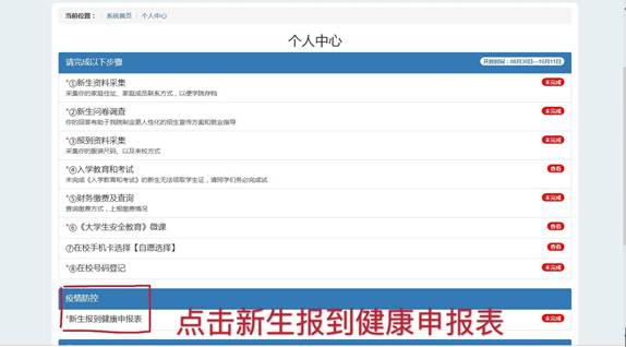 在“个人中心”中的“疫情防控”栏点击“新生报到健康申报表”