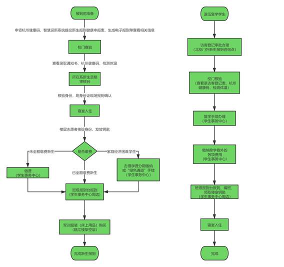 报到前准备(申领杭州健康码、智慧迎新系统提交新生报到健康申报表、生成电子报到单查看相关信息)→校门核验(查看录取通知书、杭州健康码,检测体温)→所在系新生资格审核台(核验身份,刷身份证现场报到确认)→寝室入住(楼层志愿者核验身份、发放钥匙)→办理学费分期缴纳或“绿色通道”手续(学生事务中心)→班级报到台报到(学生事务中心周边)→军训服装(床上用品)购买(瓯江楼架空层)→完成