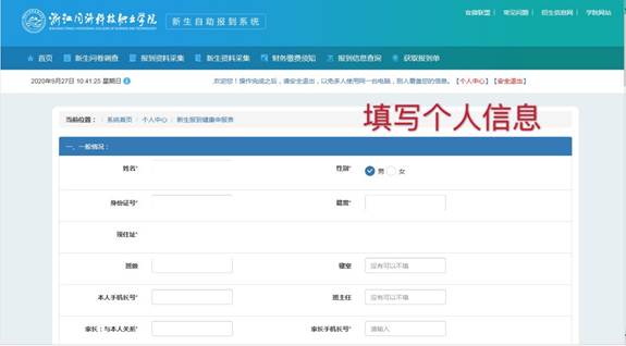 在“新生报到健康申请表”中填写各项个人信息。