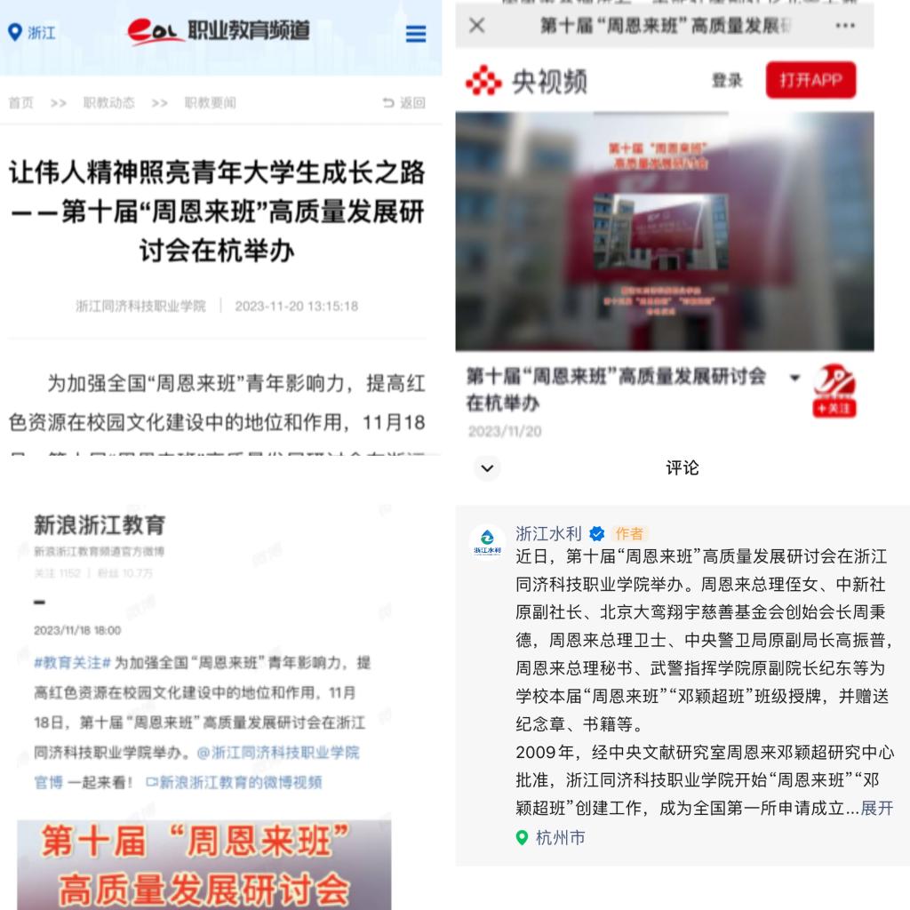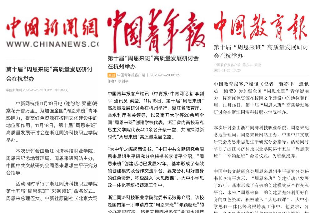 11月18日,第十届“周恩来班”高质量发展研讨会在我校举办。中国教育报、中国新闻网、中国青年报、中国教育在线、央视频、浙江水利视频号,新浪网等多家重要媒体分别以图文、视频等方式对会议作详细报道,引起多方关注。